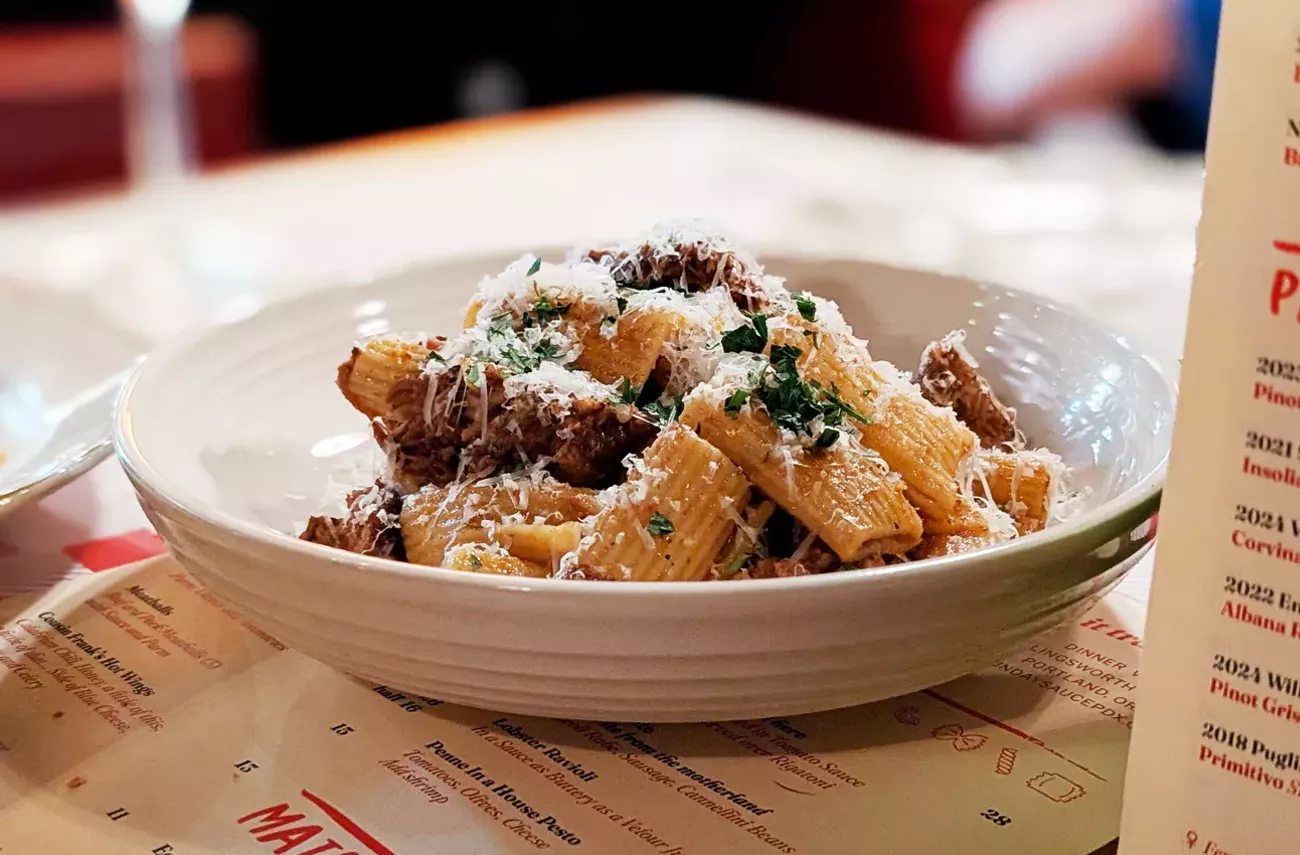 The food is also a mix of Old School and Y2K. There are pasta joint classics like orecchiette and pesto, plus fun remixes like the giardiniera misto, kind of a deconstructed hero topped with fried pepperoni. The titular Sunday sauce is an East Coast Italian American staple, more commonly found burbling away on a nonna's stovetop all afternoon. There’s also a couple of Jersey-specific specialties like disco fries—a sort of Garden State poutine which Winquest describes as “quintessential Jersey.” And of course there’s a selection of parms (chicken or eggplant), if you need something deep fried under layers of sauce and cheese. “Covered and smothered,” is how Amanda describes the Jersey approach to plating.