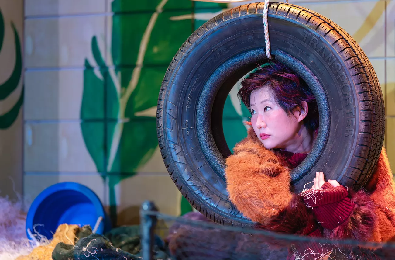 Orangutan Wookie (Barbie Wu) enters her onstage habitat before curtain rise, sliding into a tire swing to wave and mug for the crowd. Her studied movements are both graceful and long, assuaging the concerns of  those who wondered if watching a person play a great ape would be cringe-level uncomfortable.Â