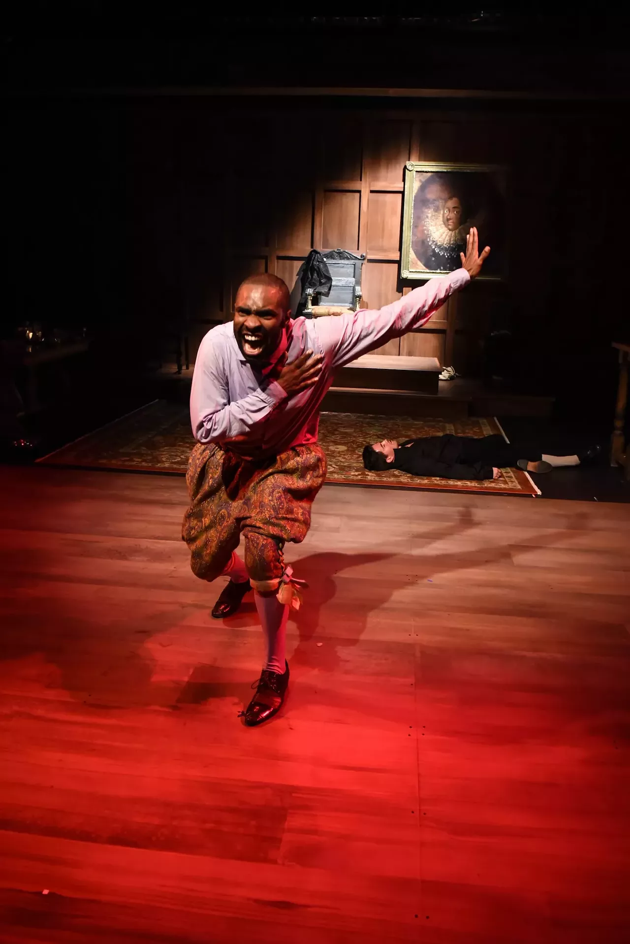 While the actors fill the stage with their oversized presences, Profile’s design team keeps things understated to let them shine. Scenic designer Peter Ksander encloses the Ellen Bye Studio in an elegant wooden paneling—a call back to the Jacobean era this work draws from—that serves as both Elizabeth’s small hut and Sir Arthur’s modest castle. It reinforces the "then-ish" setting Silverman describes in their script, anchoring the show in the past, but also creating a sense of comfort. The privacy of the home is where the characters grapple with their contradictions, where they are most themselves. Costumes by Ahmad Santos highlight Cuddy and Frank’s emotional journeys and add a layer of delightful and horrific absurdity to the inevitable conflict.