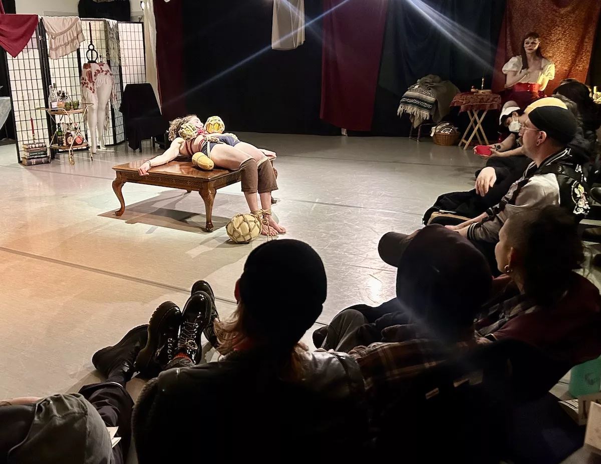 For example, before the show officially began on opening night, Genderbomb founder Hazel Andersen laid onstage covered in cut vegetables, hummus dips balanced carefully on either thigh. Attendees ventured forward to pluck crudités from the “human platter.” The moment worked well, successfully encouraging audience collaboration through kink exploration.