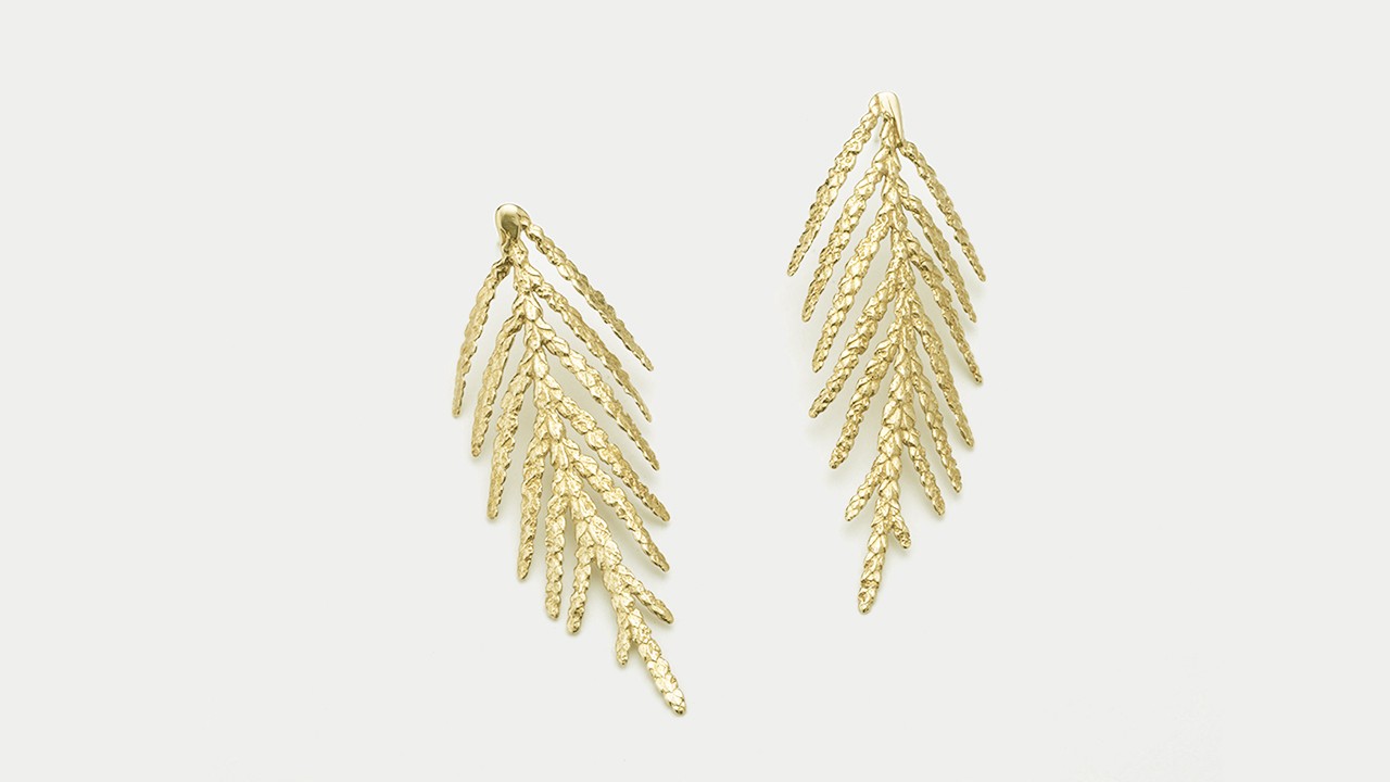 Gift the beauty of the Pacific Northwest with Stone Anvilâs 18-karat gold Cedar Branch earrings. These exquisite earrings capture the intricate details of western red cedar branches, handcrafted to perfection in solid gold. Theyâre a stunning blend of elegance and natural inspiration, making them a timeless addition to any nature loverâs collection. Available at www.stoneanviljewelry.com