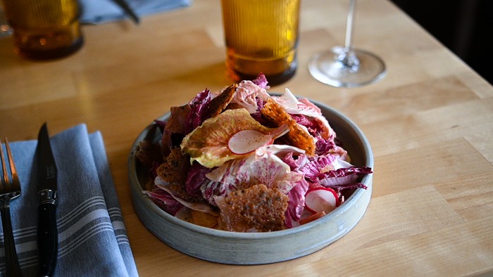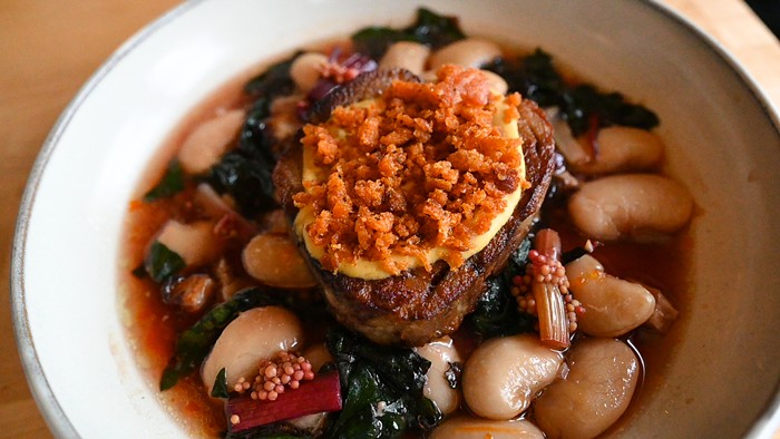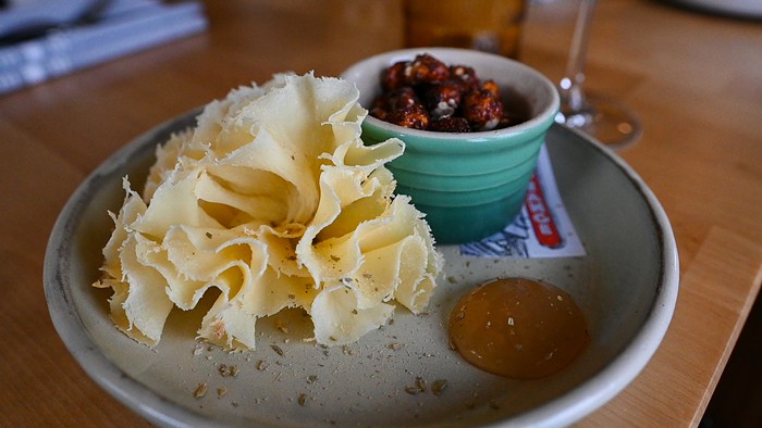 I’ve already dedicated column space to the French onion soup in my Best Bites of 2023 roundup. This sneakily vegetarian bowl starts with caramelized onions and rich broth, and then adds dreamy, soft squares of roast garlic bread pudding and crispy gruyere cheese as a topper, instead of the traditional finish of melted cheese. It’s only $10, so everyone should just order their own.
