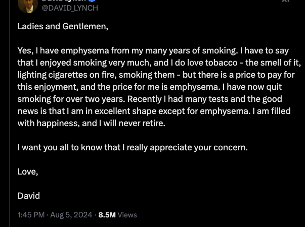 ⢠King of weird cinema David Lynch has died, his family announced yesterday. On Facebook the family wrote "Thereās a big hole in the world now that heās no longer with us. But, as he would say, 'Keep your eye on the donut and not on the hole.'ā Lynch was 78 and had publicly suffered from emphysema, which he announced in August.