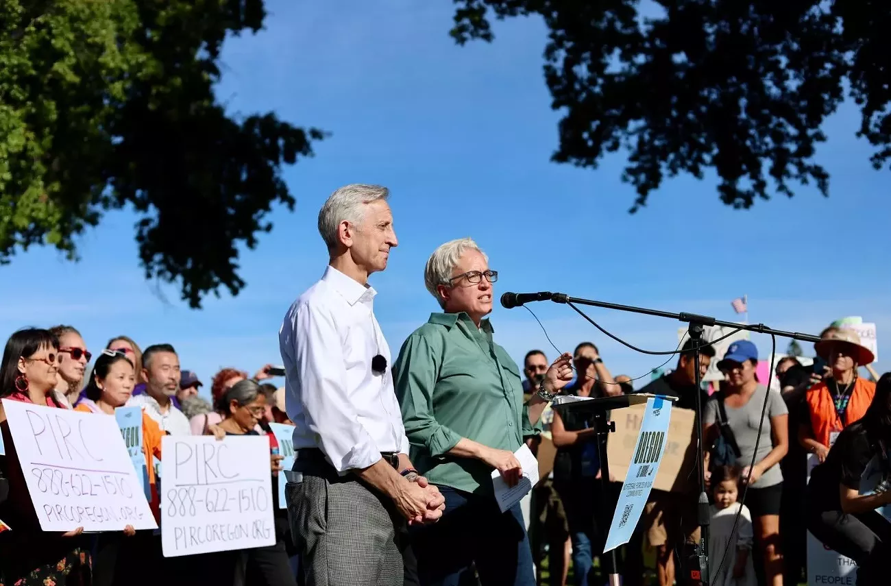 Governor Tina Kotek and Mayor Keith Wilson both present at a protest against Trumpās plans to deploy National Guard troops to Portland. āOregonians know this is bullshit,ā Kotek says.