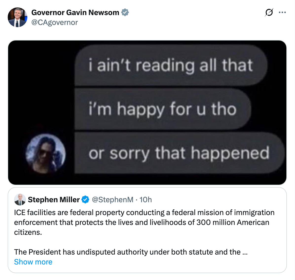⢠As previously mentioned, Trump is getting increasingly desperate in his attempts to quell any sort of dissent in blue cities and states, and (before he was hilariously shut down TWICE by an Oregon federal judge) ordered National Guard members from Texas to Portland and Chicago. Now Chi-town and the state of Illinois are suing the Trump administration for the move, calling it "patently unlawful.ā (Maybe they can borrow our federal judge for a bit?) In any case, this morning White House Chief of Smelling Like Onions Stephen Miller lost his got-damned mind over the Oregon judge who stopped Trump from sending out-of-state troops to our state, squealing that the ruling was "one of the most egregious and thunderous violations of constitutional order we have ever seen." 𤣠California Gov. Gavin Newsom responded to Miller's crybaby antics with this meme: