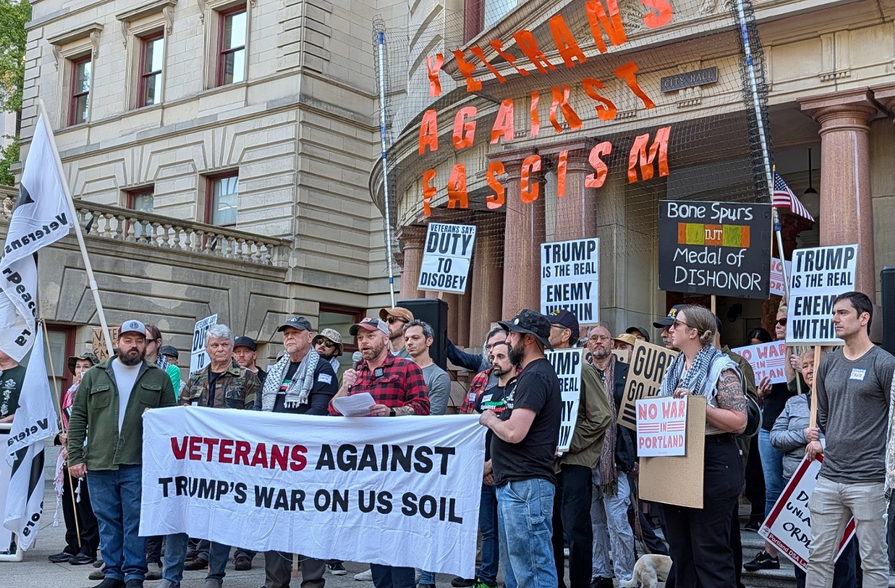 Veterans & supporters gathered at Portland City Hall, urging active-duty service members to disobey any orders to deploy to American cities. "You do not need to follow unlawful orders...you have an obligation to defect from a military that is no longer functioning in the interests of its people."