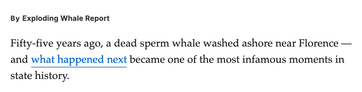 ⢠Happy Exploding Whale Day (to all who celebrate)! Today marks the 55th anniversary of one of the most controversial decisions in Oregon's history: the dynamite-ing of a giant whale carcass on the beach in the town of Florence. In order to dispose of the eight-ton whale which washed up on shore, authorities considered many methods before deciding to blow it the fuck up, sending carcass bits raining down on the terrified crowd and even crushing a car. The resulting and hilarious KATU news report also joined the exploded whale in the annals of the state's weird history. (As a side note, I'm linking to today's Oregonian story about the incident, which they admit was written by generative AI, but reviewed by human editors... a curious claim since the article was authored "by Exploding Whale Report." đ¤ But hey. Maybe their editors are AI generated as well?)