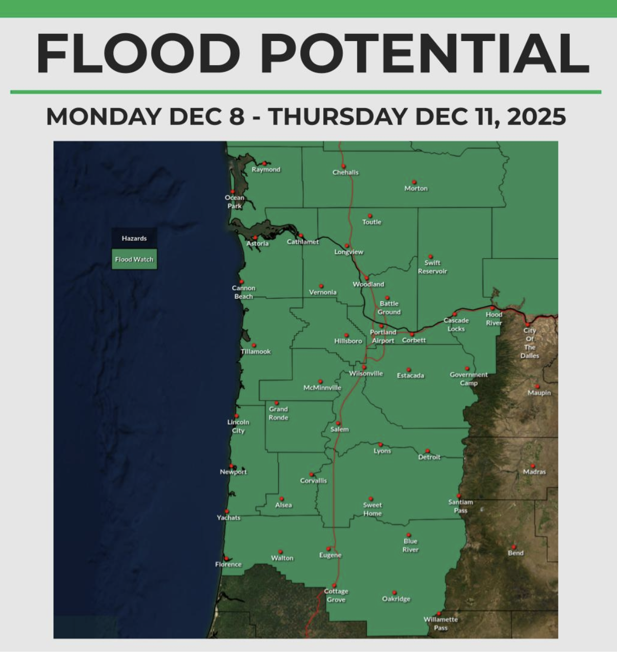 • The second week of December has brought something of a tropical weather pattern to the Pacific Northwest, resulting in unseasonably high temperatures and a lot of rain. (Though you might not be able to tell how warm it is because of the rain and high winds.) We could get several inches of rain in the next few days, with the storm expected to taper off by Thursday. Flooding is possible, so be careful! Drive slowly to avoid hydroplaning. And pray for snow when the weather pattern changes. Right now, the lack of snowpack in the Cascades means less potential for river flooding during this atmospheric river, but let's hope things turn around quickly.