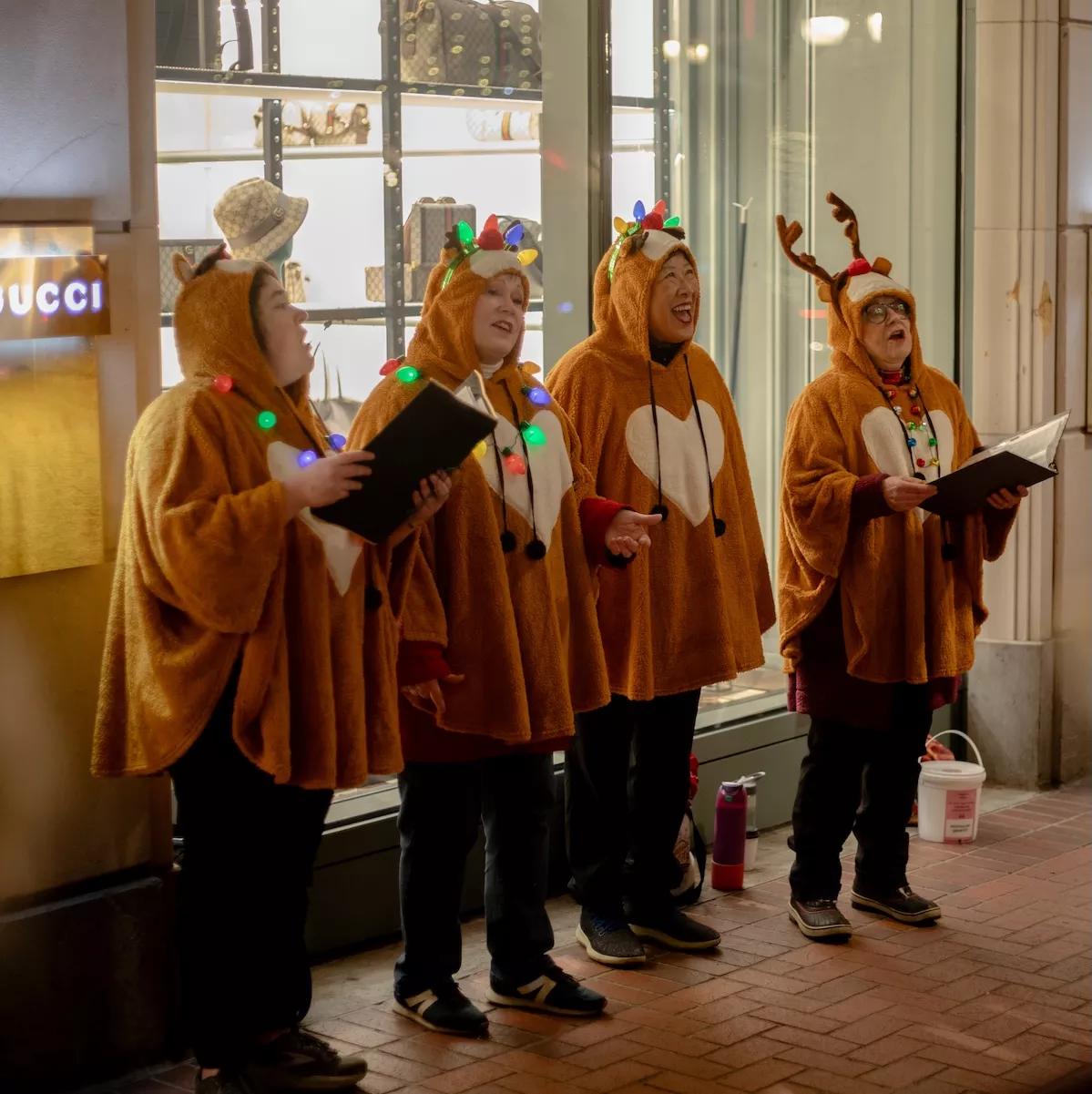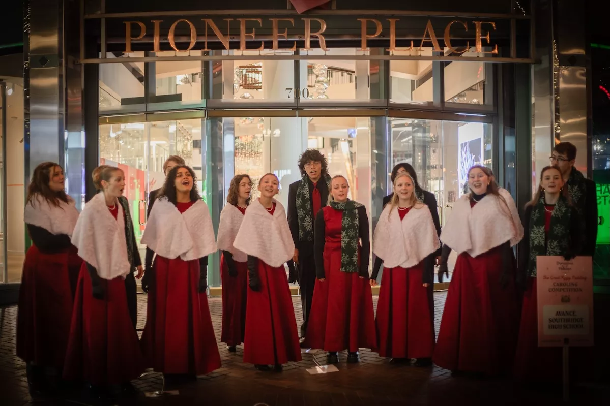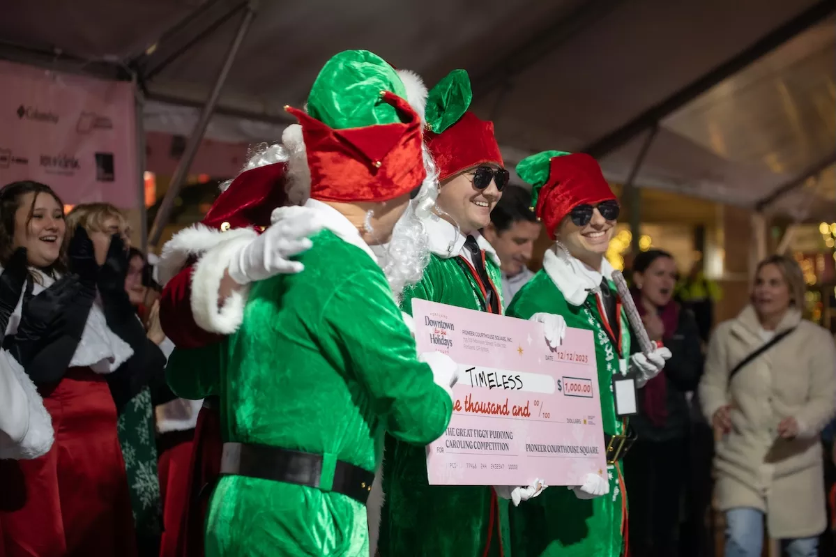 Seeing that treading from door to door, plying your holiday melodies to families bundled up on their porches isn’t really considered normal anymore, an alternative was formed: the groups started in Pioneer Square, and spread out around the area to 16 discreet outdoor locations, while revelers in attendance floated from one performance to another, dropping wooden coins in their little buckets to vote for their favorites. The group who got the most coins would be granted the title of "People’s Choice." While this was happening, The Dickens Carolers, a small professional caroling group decked out in Victorian winter attire, went from performance to performance, lending a more refined ear to the judgement of the various groups. They selected a top three who were ushered to a stage constructed in the middle of Pioneer Square. Everyone in the ample crowd cheered for their favorite, and the group that generated the loudest applause was granted a check for one thousand dollars.