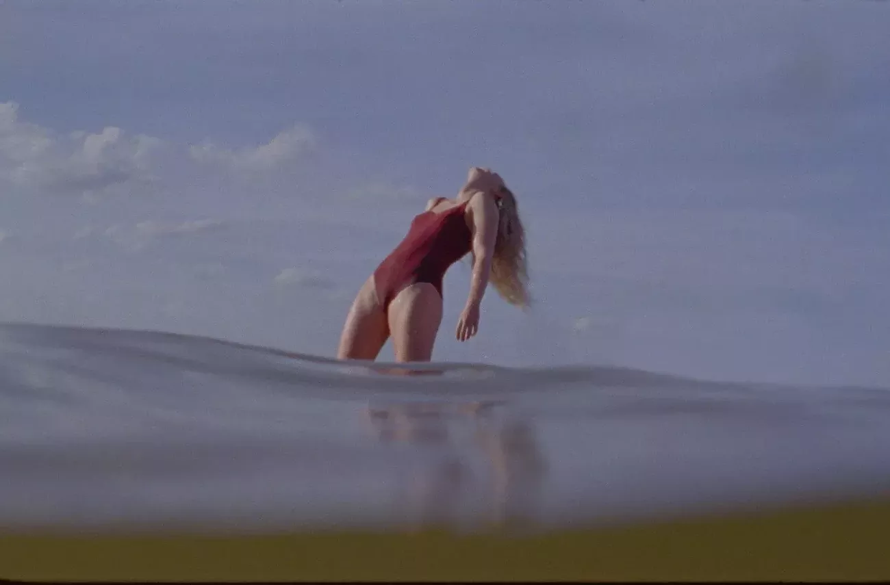 As she grows older and more defiant, Lidia’s interior world is preoccupied by bodies in locker rooms, sweat dripping, passed flasks, and water water water. “My bedroom holds the wet of my body,” she murmurs in voiceover. “It smells like my sweat and chlorine.” Her escape from home is a full-ride swimming scholarship to Texas Tech, where she packs up and heads after calling her father a “motherfucker.” There, she disappears into an epic poem of pills, drinking, and sex with people of all genders. Lidia meets Philip (Earl Cave), a gentle troubadour who is no match for her deeply wounded anger. He strums a guitar while Lidia spits on him.