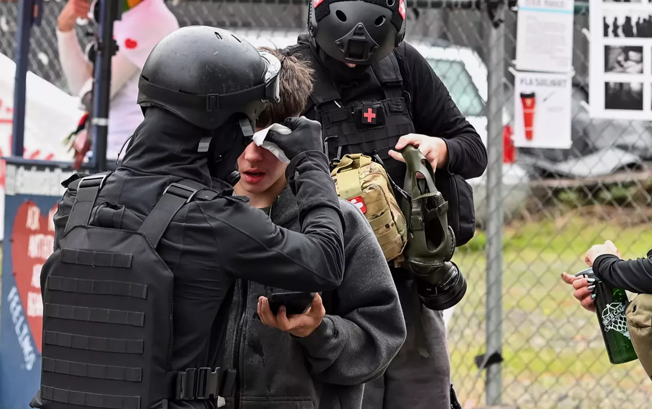 “This is probably my sixth night out here in the past 10 days,” Rose said, undeterred by rain and occasional blasts of burning gas. “Basically what they do is wait for you to step on the street or step over the [painted] line, and they use that as an excuse to come out and use violence.”