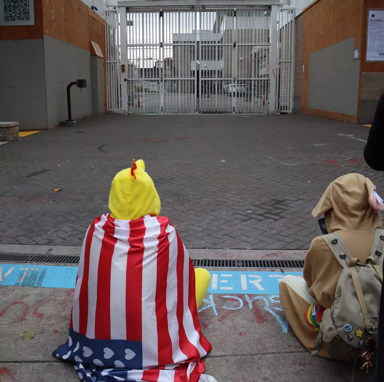 next to another protester in an animal costume in front of a gated entry at Portland's ICE building. courtney vaughn