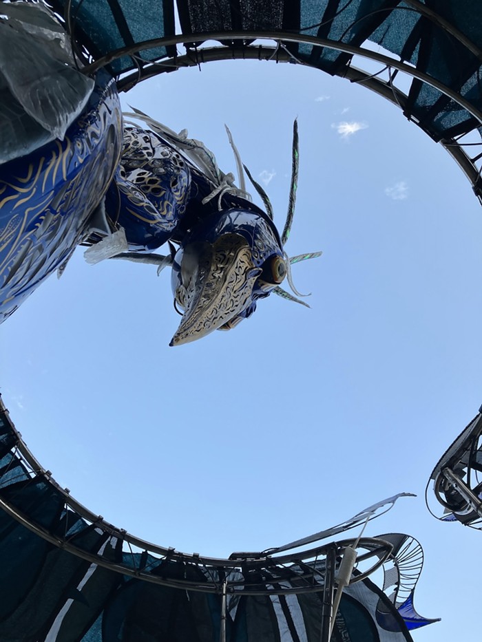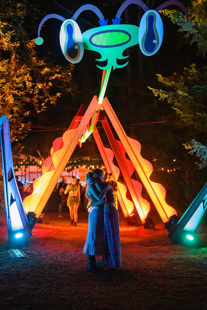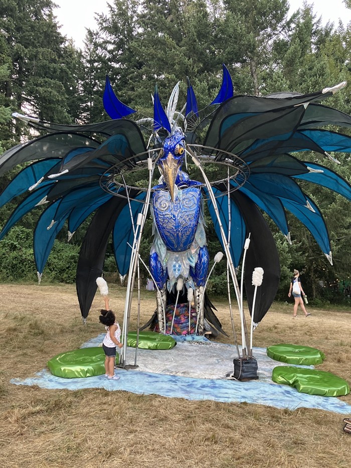 Throughout a typical Pickathon weekendâwhich can involve everything from shuttling, camping, hauling gear, imbibing, and quite literally hiking through the bumpy woods in 90-degree heat to catch as many live performances as one can fit in a dayâfinding organic wooden nooks to tuck off into and rest, or cute art installations designed to provide shade was necessary for survival and maximum enjoyment. There were plenty of art installations and stage designs that resembled critters, adding to the family-friendly vibes, but Heron's Embrace by Portal Arts Collective struck a particularly comforting and delightful tone. Conveniently located in the field by the Paddock Stage and adjacent the Medical Tent, the heron sat atop a small nest, with a single shimmering egg the size of a basketball, and glowed in the dark like an alien species. My favorite part: There was a big soft carpet that was clean-ish, and a few '90s-style plastic-upholstered cushions for sitting! Whether dancing, lounging, resting, or running amok under the overbearing yet beautiful behemoth, the kids of Pickathon (mine included) looked absolutely thrilled to gaze up into its crazed eyesâand I, an adult woman, concur. JM