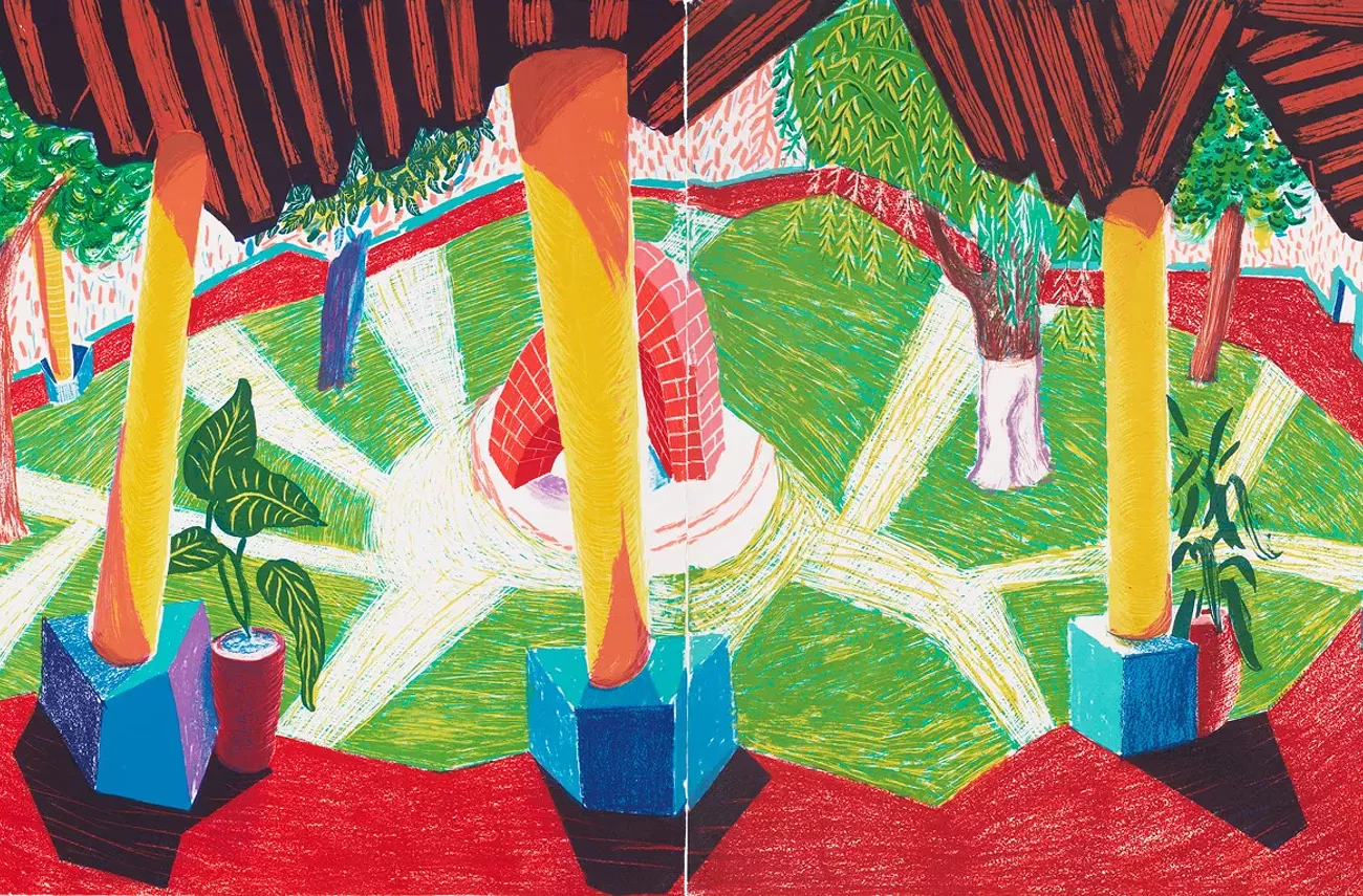 The idea of reversed perspective remains Hockney’s central thesis. Put simply, you are the vanishing point. Rather than gazing toward a distant horizon, Hockney’s goal is that your eye moves through the image, the way it moves through space.